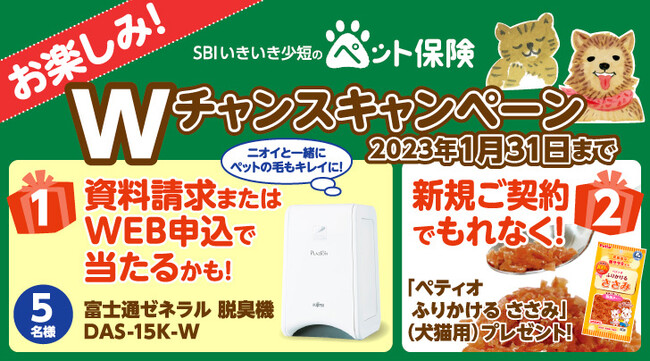 SBIいきいき少額短期保険株式会社(本社:東京都港区、代表取締役社長:新村 光由、以下「当社」)は、ペット保険の資料請求またはWEB申込をされた方、新規ご契約いただいた方、それぞれを対象としたプレゼントキャンペーンを実施します。