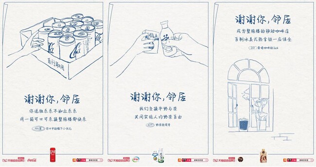 危機的状況下においては、思いやりや共感が最も大きなマーケティング効果を発揮します。Tmallは、9つの消費財ブランドと共同で、上海において新型コロナウイルス感染症が拡大している時期に住民がどのように団結したかをドキュメンタリーにする、「Thank you, my neighbor」キャンペーンを実施しました。これをきっかけに、住民たちは隔離期間中に隣人や周囲の人々のためにTmallで日用品などを隣人へのギフトとして購入するようになりました。