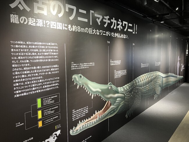 本企画展の主役の一つである「ワニ」は、大阪大学総合学術博物館の協力のもと、太古のワニ「マチカネワニ」の化石や、頭骨のレプリカ、8mにもなる実寸大のイラストなどで解説します。