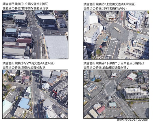 標準的な交差点形状や特殊な交差点形状で正確に交通量を計測ができるかという観点と共に、過去の調査や交通データから「歩行者通行が多い」などの特徴をもった交差点を選定しました。採択企業等の皆様と協議を行い、交差点の特徴にあった調査を目指します。