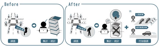 す。測定対象の交差点を4箇所選定し、時間帯別・方向別・車種別の車両台数を測定するとともに、交差点の事情に合わせた付加価値のデータの測定・分析を想定しています。
