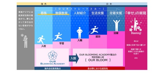 アジア各国における人財教育と、特定技能に特化した日本国内への人財紹介事業を展開※。2024年12月31日現在、累計教育人数7,718名(自社海外アカデミー在学及び終了した累計人数)、特定技能試験の合格者を6,216名輩出しております。特定技能人財の職業紹介においては5,688名が内定、4,393名(累計)がすでに紹介先で就業を開始しております。海外現地の自社教育拠点である「OUR BLOOMING ACADEMY」における日本語および特定技能教育から人材紹介、就業後の生活や資格取得の支援までをワンストップで行う独自スキーム「OURストレートスルー」により、安定して長く働ける人財をご紹介しております。