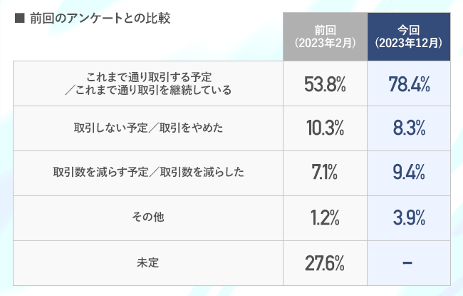 免税事業者との取引は「これまで通り取引を継続している」が8割近くに。前回調査から3割増