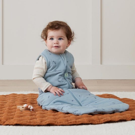 ジャージースリーピングバッグは、スワドルに似たフィット感を残しながら、寝返りをしはじめた赤ちゃんが足を自由に動かせるように、脚周りのスペースが広めに設計されています。