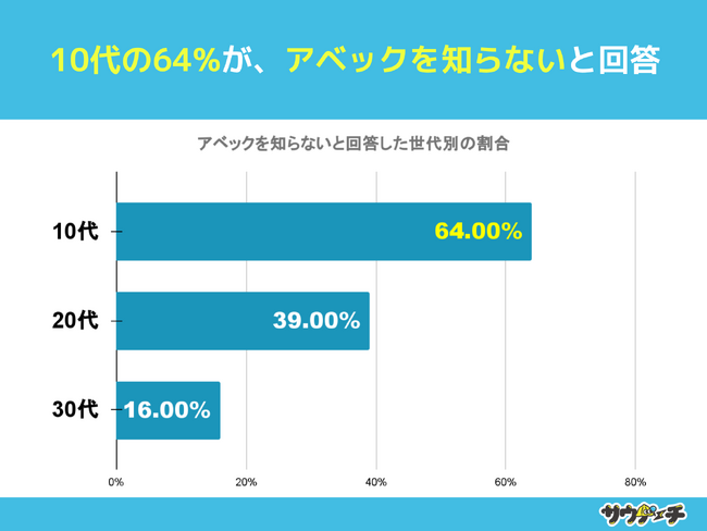 また、アベックを知らないと回答した割合を世代別でみてみますと、10代の64%が最も高く、次いで20代の39%、30代が16%という結果となりました。