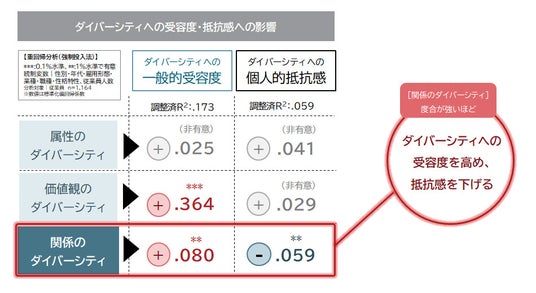 「関係のダイバーシティ」が与える影響:ダイバーシティへの一般的受容度、個人的抵抗感に対して与える影響を分析すると、「属性のダイバーシティ」と「価値観のダイバーシティ」は、どちらの要素も高める傾向が見られる一方、「関係のダイバーシティ」は一般的受容度を高めつつ、個人的抵抗感を下げる傾向が確認された。