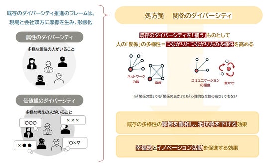 ここでの関係のダイバーシティとは、「関係の質」や「仲の良さ」ではない。ネットワークの数と密度、コミュニケーションの頻度と豊かさといった「つながりとつながり方の多様性」を示すものだ。分析の結果、関係のダイバーシティ指標が高いほど、ダイバーシティ施策の抵抗感を下げ、組織のウェルビーイングやイノベーション活動を促進することが示唆された。