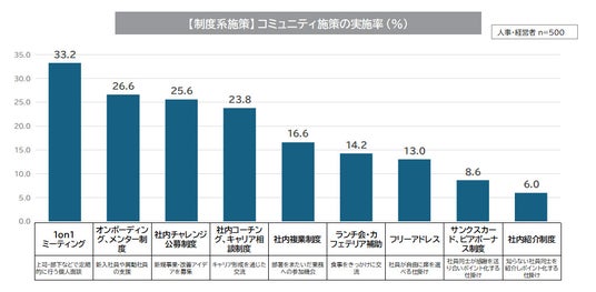 企業のネットワーク/コミュニティ施策実施率(制度系):制度系のコミュニティ施策の実態を見た。最も多く行われている取り組みは「1on1ミーティング」で33.2%。次いで、「オンボーディング、メンター制度(26.6%)」、「社内チャレンジ公募制度(25.6%)」が続く。