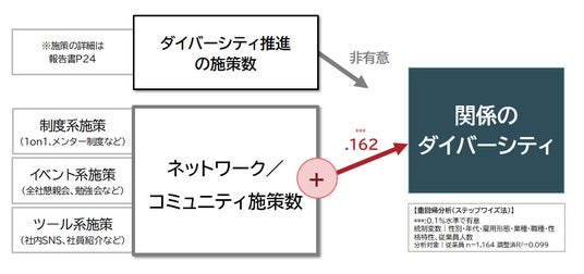 関係のダイバーシティに対してプラスの関係がみられたコミュニティ施策:各コミュニティ施策が「関係のダイバーシティ」に与える影響を多変量解析で分析した。1.広げる:ネットワークの数を増やす施策、2.太くする:会話頻度を増やす施策、3.かき混ぜる:会話内容を分散させる施策、4.つなげる:知り合い同士をつなぐ施策の4施策が「関係のダイバーシティ」を強化する傾向。
