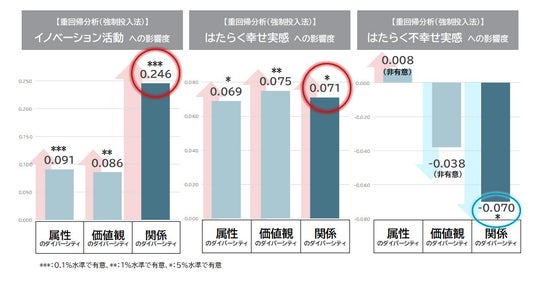 イノベーションの促進:また、「関係のダイバーシティ」は「イノベーション活動」を強く促進し、かつ「はたらく不幸せ実感(働くことを通じて不幸せを感じている)」(※)を有意に下げる効果が確認された。これらは他のダイバーシティ指標(属性・価値観)と比べても、特に際立った傾向である。