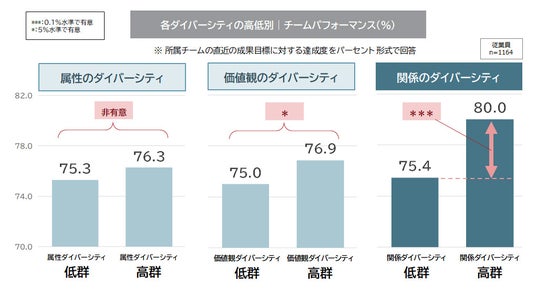 チームパフォーマンスの促進:属性・価値観・関係の各ダイバーシティとチームパフォーマンスの関係性を見た。「属性のダイバーシティ」や「価値観のダイバーシティ」と比較して、「関係のダイバーシティ」は、スコアが高いほどチームパフォーマンスが高くなる傾向が確認された。