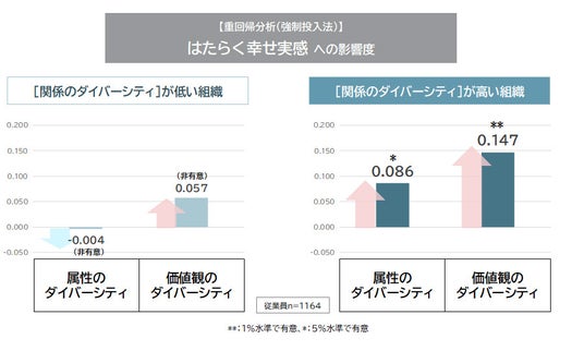 はたらく幸せ実感への影響:加えて、「関係のダイバーシティ」が、「属性」「価値観」のダイバーシティの効果を高める傾向も見られた。「関係のダイバーシティ」が確保されている組織ほど、「属性」や「価値観」のダイバーシティが「はたらく幸せ実感」に結びつきやすいことが確認された。