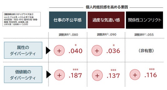 ダイバーシティへの個人的抵抗感を高める要因:個人的抵抗感を高める要因のなかでも、「施策の空回り感」の意識が強いほど、ダイバーシティへの抵抗感が最も高まる傾向が確認された。
