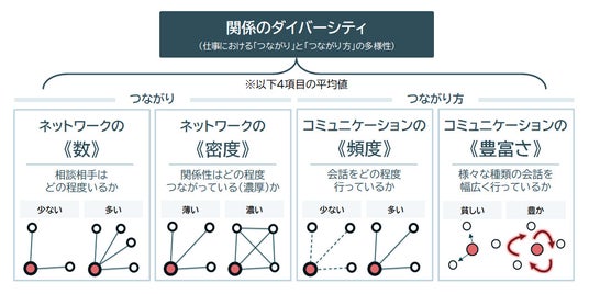 そこで本レポートは新しい多様性の観点として、「関係のダイバーシティ」を提案する。これは人材同士の「つながり」と「つながり方」の多様性を測る指標である。