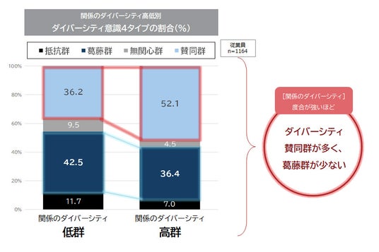 また、「関係のダイバーシティ」スコアの高群は、低群よりも「ダイバーシティ賛同群」が多く、「ダイバーシティ葛藤群」が少ない傾向が確認された。