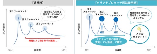 ※4 クリアラプロセッサ回路:性別などにより異なる音声の周波数をリアルタイムで解析し、各周波数の聴こえやすさへの影響度に応じて増幅する音声明瞭化回路。特許第7682346号