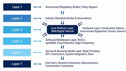 21層のバリューチェーン(ハードウェア企業、プラットフォーム企業、サービスプロバイダ、建材メーカー、PM会社、研究機関、VC等)が統合プラットフォーム上で連結。相互運用標準(ROS 2、MassRobotics、OPC UA等)による共通化が急速に進展。