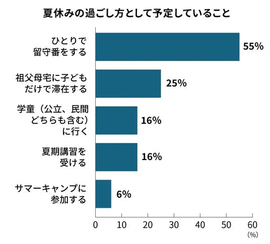 夏休み期間中、小学生の子どもたちはどのように過ごすのでしょうか。塾選ジャーナルのアンケート調査では、最も多かったのが「ひとりで留守番をする」という選択肢であり、55%にのぼります。これは多くの共働き家庭が直面する現実を反映していると言えそうです。