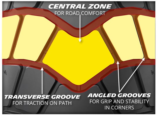 中央部は長寿命、サイド部はコーナリング時に優れたグリップを提供