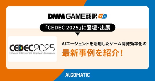 株式会社Algomatic(本社:東京都港区、代表取締役:大野峻典)が提供する、ゲーム翻訳特化のAIエージェントサービス『DMM GAME翻訳』は、パシフィコ横浜にて開催される『CEDEC 2025』(2025年7月22日~2025年7月24日)に出展いたします。