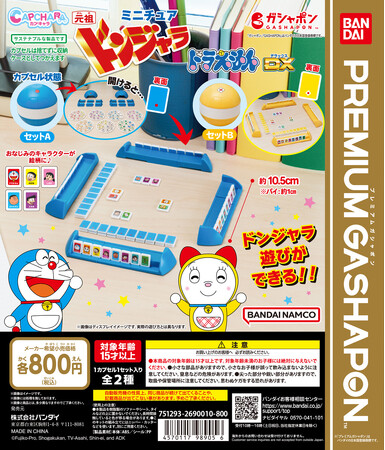 株式会社バンダイ ベンダー事業部は、子どもから大人まで愛される国民的キャラクター『ドラえもん』のドンジャラをミニチュアサイズにした「カプキャラ ミニチュア 元祖ドンジャラドラえもんDX」(1回800円・税10%込、全2種)を2023年10月第4週から順次、全国のガシャポンバンダイオフィシャルショップ、玩具売場、量販店、家電店などに設置されたカプセルトイ自販機にて発売いたします。