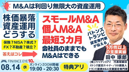 株式会社ファイナンスアイ(所在地:大阪市、代表:田中琢郎)は、スモールM&A・個人M&A・M&A起業を目指す起業家や中小企業の経営者に向けて特別なセミナーを開催致します。『株価暴落!アナタの資産はどうなる?会社員のままでもできる!個人M&Aは利回り無限大の資産運用。実話!会社員が元手●万円でスモールM&A!数年で年商●億円の社長に!最短3カ月のM&A成功戦略。夏休みに始めて年内に実現へ』(※参加者の顔出しナシ)と題したこのセミナーでは、日本国内M&A成約数1位のBATONZ(バトンズ)認定パートナー/認定アドバイザー/認定DD調査人、国内最大級のM&AサイトTRANBI(トランビ)提携のM&A支援の認定専門家である田中琢郎社長自らが、1万人以上の起業家や経営者を支援した実戦経験をもとに、個人M&AやスモールM&Aを成功させるための戦略をお伝えします。本セミナーは、2024年8月14日(水)19:00より、オンラインZOOMで開催します。コロナ禍を乗り越え、億超えの起業家を生み出し続けたファイナンスアイが分かりやすく伝えます。セミナーでは田中社長とライブで質疑応答ができるので具体的なアドバイスが欲しい人はチャンスです。セミナー申込時の受付フォームで事前質問に記入してもらえれば、セミナー中に回答できそうにない内容でも別途具体的なアドバイスを受けられます。この機会に誰にも相談できなかった悩みや疑問を解決しましょう。