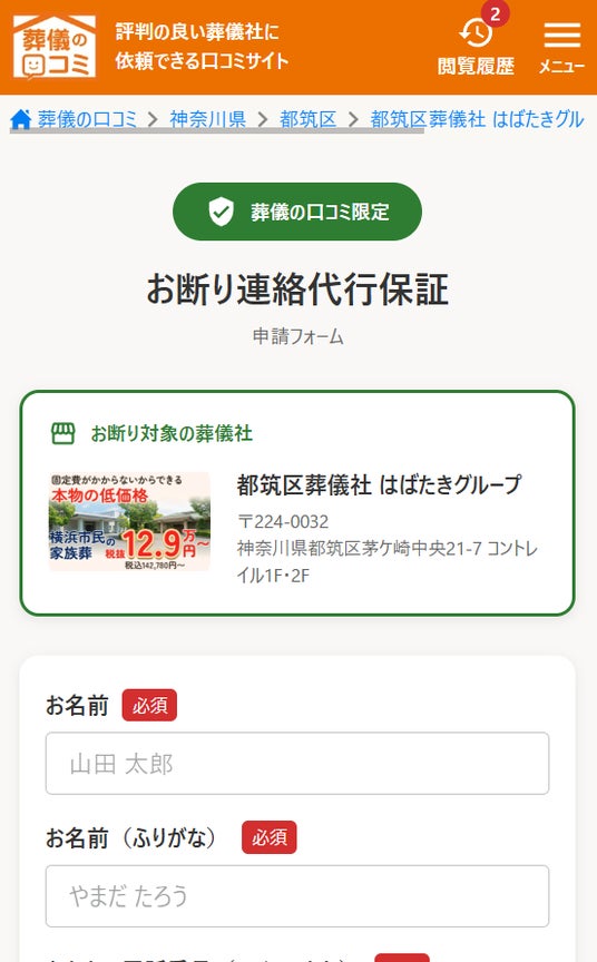 「お断り連絡代行保証」は、葬儀社へ問い合わせた後に「断りづらい」「言いにくい」と感じる利用者に代わり、「葬儀の口コミ」が葬儀社へお断りの連絡を行うものです。葬儀業界においてお断りを直接代行するサービスは、当社が調べた限り他に例がなく、業界初(葬儀社へお断りの連絡を代行するサービスとして。当社調べ、2026年2月24日時点)の取り組みです。