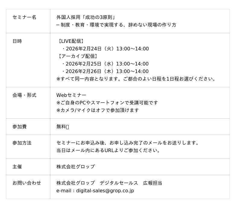 人材サービス事業を展開する[株式会社グロップ](本社:岡山県岡山市、代表取締役社長:原田 竜一郎)は、2026年2月24日(火)に【外国人採用】をテーマとした、3社共催ウェビナーを開催いたします。本ウェビナーでは、外国人材が「辞めない戦力」となるための3つの成功原則【制度・教育・環境】を徹底解説します。貴社の外国人材採用を成功に導き、持続可能な生産体制を築くための具体的なアクションプランが明確になります。ぜひ、この機会にご参加ください。