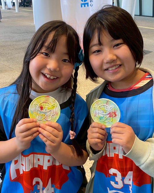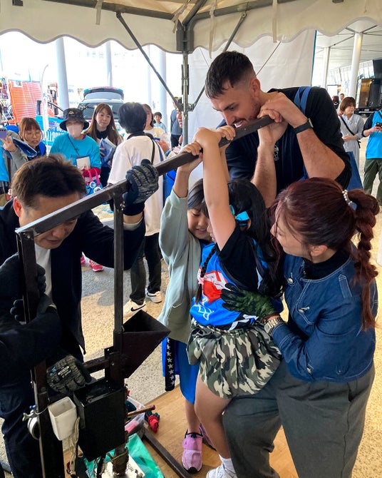 この体験に、佐賀バルーナーズの**チェイス・フィーラー選手**もサプライズで参加。子どもたちと一緒にレバーを押してアップサイクルの工程を共にし、完成したコースターを笑顔で掲げる姿に、会場からは大きな歓声が上がりました。