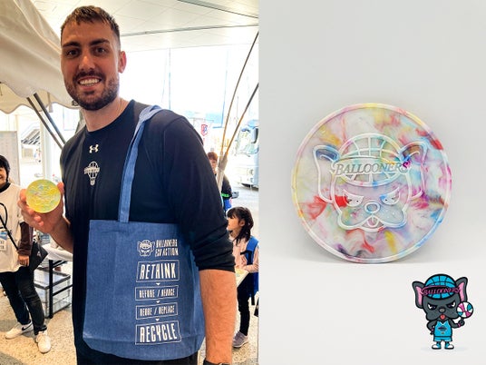 左:佐賀バルーナーズのチェイス・フィーラー選手 右:ペットボトルキャップが「バルたんコースター」