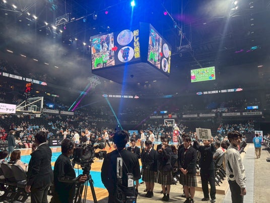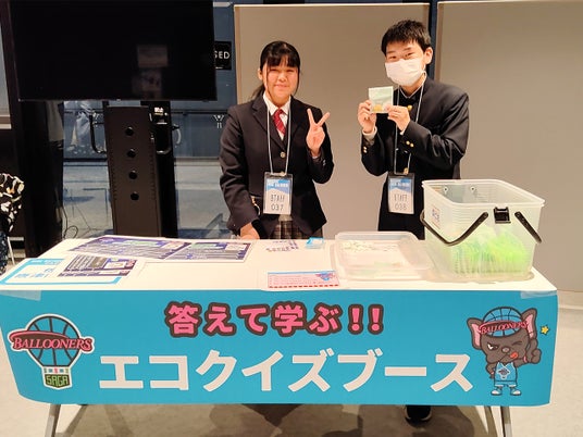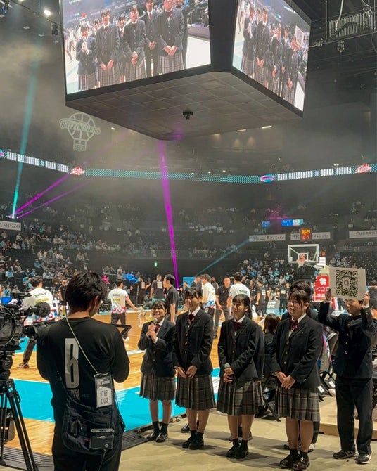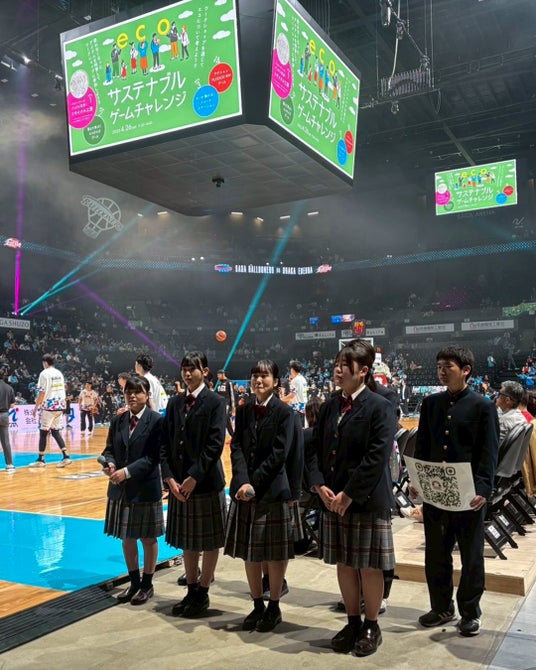 唐津南高校「虹の松原プロジェクトチーム」の生徒が、Bリーグ公式戦のアリーナ内で【高校生初】の環境発表