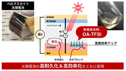 産総研グループ(国立研究開発法人産業技術総合研究所(以下「産総研」という)および株式会社AIST Solutionsの総称)が開発した材料「OA-TFSI」が製品化されます。OA-TFSIは、ペロブスカイト太陽電池の正孔輸送材料の原料溶液に添加することで、太陽電池を高効率化かつ高耐久化できます。本材料は東京化成工業株式会社が製品化し、2026年2月6日より一般販売します。OA-TFSIが普及することにより、ペロブスカイト太陽電池のさらなる社会実装の推進に貢献すると期待されます。