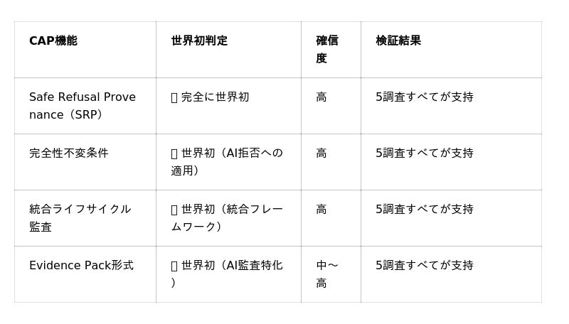 VSOは、CAP-SRPの「世界初」主張を裏付けるため、異なる手法とAIリサーチプラットフォームを用いた5つの独立した調査を実施しました。170以上の学術論文、技術標準、業界実装、規制文書を精査した結果、以下の結論が得られました。