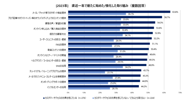 次に、直近一年で顧客に対して新たに始めた/強化した取り組みについて聞いてみたところ、効果を感じている人の63.8%が「メール/チャット等でのサポート情報提供」、次いで、58.7%の人が「ブログ記事やホワイトペーパー等のオウンドメディア上でのコンテンツ提供」など、”テックタッチ”の強化が垣間見える結果となりました。前年もその傾向がありましたが、今年はさらに取り組む人の割合が増加しています。今年に関していえば「ChatGPT」が注目を集め、チャットボットやFAQの提供が進んだ企業もあったのではないでしょうか。下記のグラフからは、カスタマーサクセスの効果を感じている層、感じていない/どちらとも言えない層では施策の取り組み度合いに大きく差があることがわかります。
