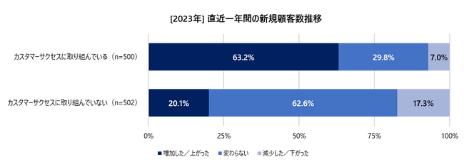 カスタマーサクセスに取り組んでいる、取り組んでいないそれぞれの層に対し、直近一年の新規顧客数および新規売上の推移について尋ねてみると、カスタマーサクセスに取り組んでいる層はいずれも「増加した/上がった」と回答した人が6割を上回りました。反対に取り組んでいない層の約6割は、新規顧客数も新規売上数も「変わらない」という結果になりました。