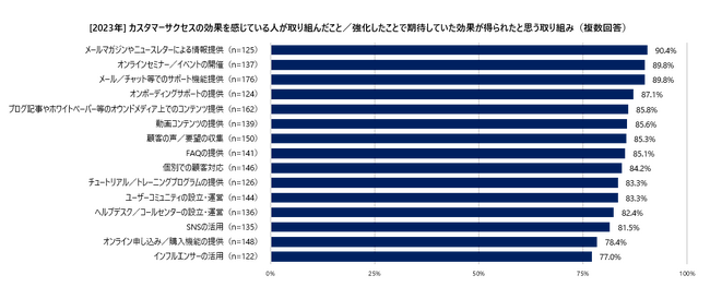 また、カスタマーサクセスの効果を感じている人のほとんどがこれら新たな取り組みを始めたり、取り組みの強化行ったりすることで「期待していた効果が得られた」と回答しています。すべての施策がすべての企業に効果をもたらすわけでは当然ありませんが、自社の商材とユーザーの性質に合わせたコンテンツ発信やサポート体制を効果的に行うことで、効果に繋げられると考えられます。