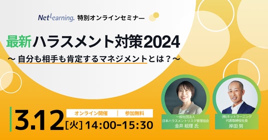 (株)ネットラーニング(東京都新宿区、代表取締役:岸田徹)は、ハラスメント対策研修のお問い合わせが増加していることを受け、この度、日本ハラスメントリスク管理協会の代表理事 金井様をゲストに迎え、「最新ハラスメント対策2024 ~自分も相手も肯定するマネジメントとは?~」と題した特別無料セミナーを、2024年3月12日(火)14時から開催いたします。