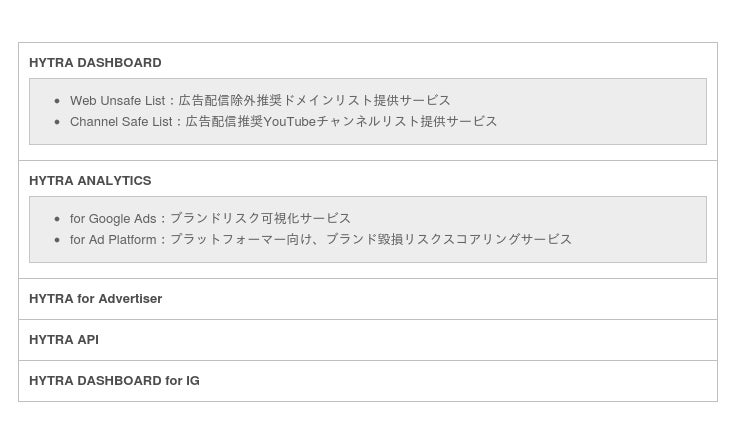 また、上記を受け、「HYTRA DASHBOARD」及び「HYTRA DASHBOARD Safe Video List」の2つのサービスを、「HYTRA DASHBOARD Web Unsafe List」「HYTRA DASHBOARD Channel Safe List」へと名称変更いたします。