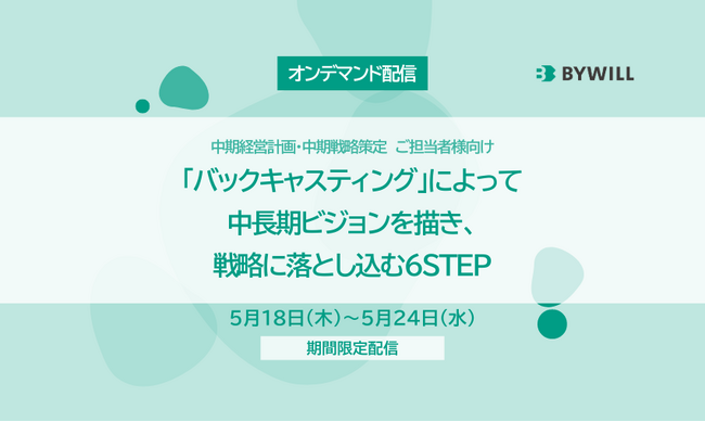 「GX 推進」と「ブランディング」を通じて日本企業のサステナビリティ経営を支援する株式会社バイウィル(本社:東京都中央区、代表取締役 CEO:下村雄一郎)は、無料セミナー「『バックキャスティング』によって中長期ビジョンを描き、戦略に落とし込む6STEP」のオンデマンド配信を実施致します。2023年5月18日(木)~5月24日(水)の期間限定配信となっております。