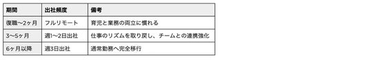 こうした社会的背景を踏まえ、当社では「育児休業からの復職時」及び「お子さんの小学校入学時」における働き方支援を2025年4月度より開始します。当社の出社頻度については、人材育成や組織コミュニケーションの観点から週3日勤務を原則としていますが(組織によって異なります)、その中でも、特に家庭/育児と仕事のバランスが取りにくい時期に合わせて、徐々にどちらにも慣れていけるよう支援します。
