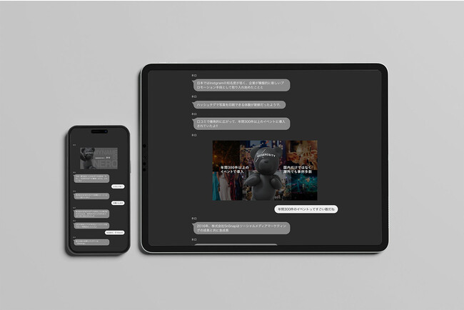 GENEROSITYが提供するWEBサービス「Chat Guide」は、ユーザーが視覚的に読みやすいチャット形式で文章や動画を展開することができ、WEBブラウザを通じてブランドストーリーの訴求や会場案内として情報の提供を可能とするサービスです。