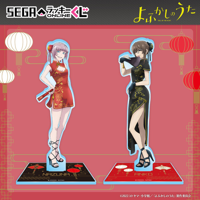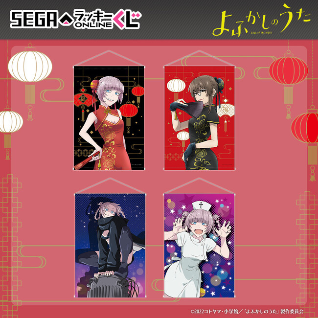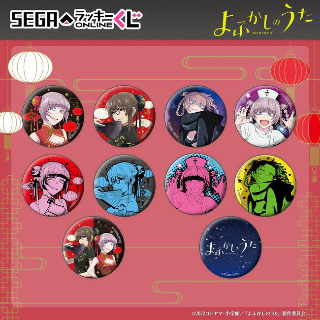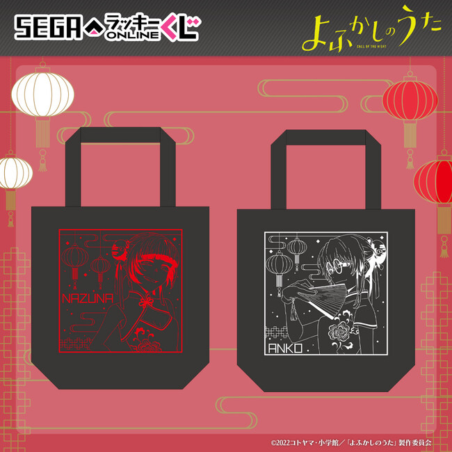セガ ラッキーくじオンライン「よふかしのうた」では、セガ限定描きおろしイラスト4点をアイテム化。そのうち、チャイナドレスに身を包んだ「七草ナズナ」や「鶯餡子」のイラストは初公開となっております。アイテムは、トートバッグ、B2タペストリー、アクリルスタンド、アクリルキーホルダー、BIG缶バッジをご用意。もれなくどれかが当たります。