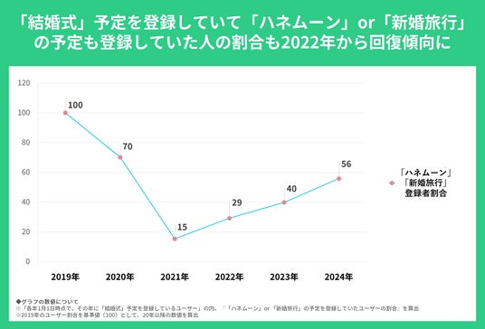 結婚式の予定を登録していた人の内、「新婚旅行」や「ハネムーン」といった予定を登録している人の割合を確認したところ、「結婚式」の予定数推移と同様に、コロナ禍で落ち込んでいた数字が2022年から回復している傾向が見られました。