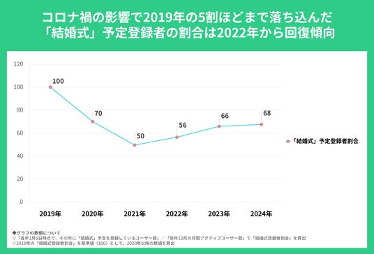 コロナ禍以前の5割まで減少した「結婚式」予定の登録者率は直近3年で復調傾向