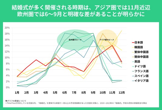 その結果、欧州圏で使用される言語(英語、フランス語、ドイツ語、イタリア語、スペイン語)では6~9月に「結婚式」の予定が多くなり、アジア圏で使用される言語(韓国語、繁体中国語、簡体中国語)では10月・11月に予定が多くなる結果となり、地域によって結婚式を開催することが多い時期に違いがあることがわかりました。