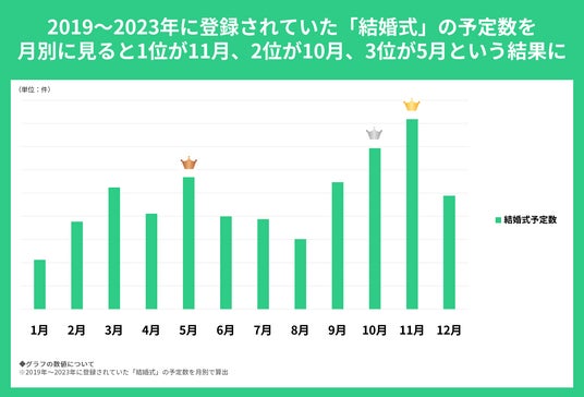 今回「ジューンブライド」と呼ばれるシーズンということで「結婚式」を6月のテーマに据えた調査を実施しましたが、実際は何月に結婚式が最も多く開催されるのかを2019年から2023年の月別の「結婚式」の予定数から分析してみました。