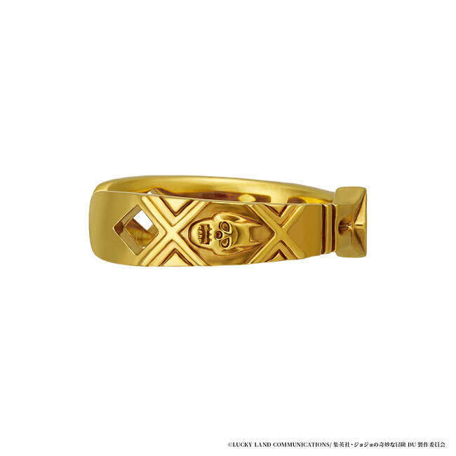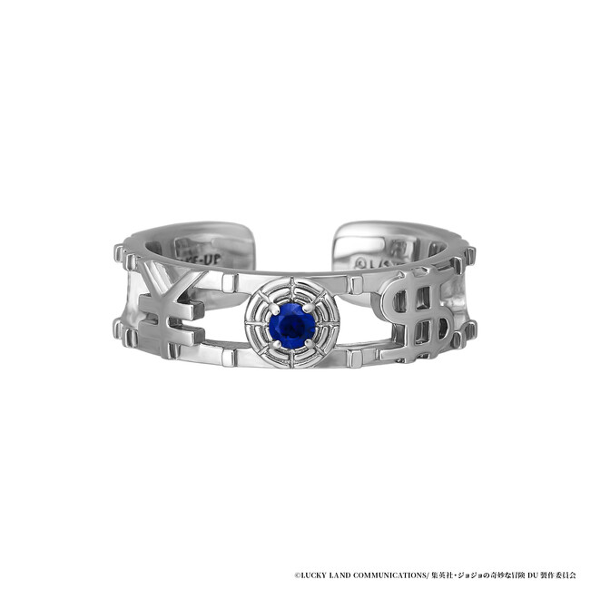 中央にはザ・ハンドをイメージし、右手の模様を施した石座にブルーの石をセッティング。両サイドには億泰の学ランの“¥”と“$”のマークをデザインしました。上下のラインは億泰が着けている2本のベルトをイメージしています。