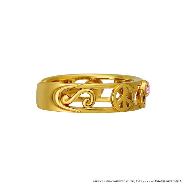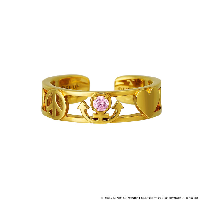 仗助の学ランについているハート、ピースマーク、錨の装飾を全体の中にデザインし、見る方向によって異なった表情を楽しめるカフリングに仕上げました。センターにはクレイジー・ダイヤモンドを表現したピンクの石が輝きます。