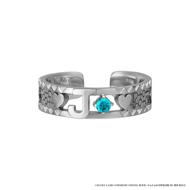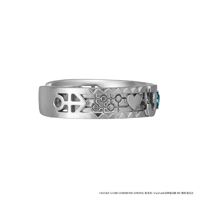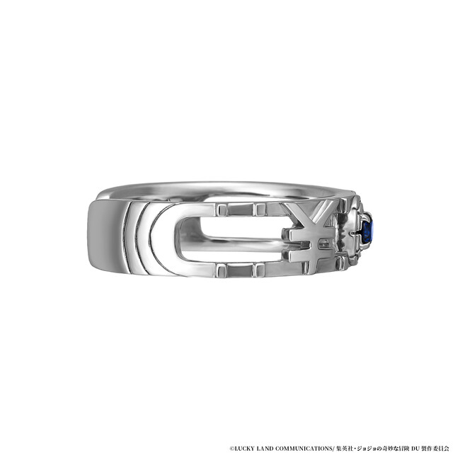 帽子や襟の装飾から、“J”とハートをメインにデザイン。ベルトや服の模様をさり気なくあしらい、承太郎の帽子の特徴的なマークも透かしで表現しました。スタープラチナをイメージしたライトブルーの石が中央に輝きます。
