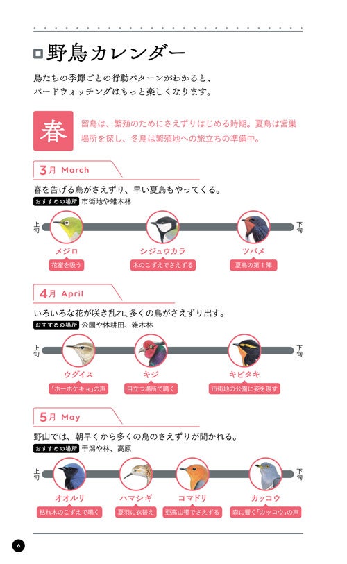 - 鳥の季節ごとの行動パターンや、その時期におすすめの観察場所を1か月ごとに提案する『野鳥カレンダー』を掲載しました。これを参考に鳥見に出かければ、初めての人でも楽しくバードウオッチングの世界に入ることができます。